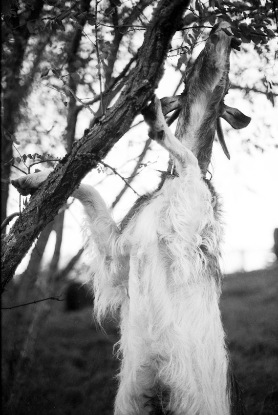 Quand pilou le bouc veut manger des feuilles sur l'arbre il se dresse très haut.