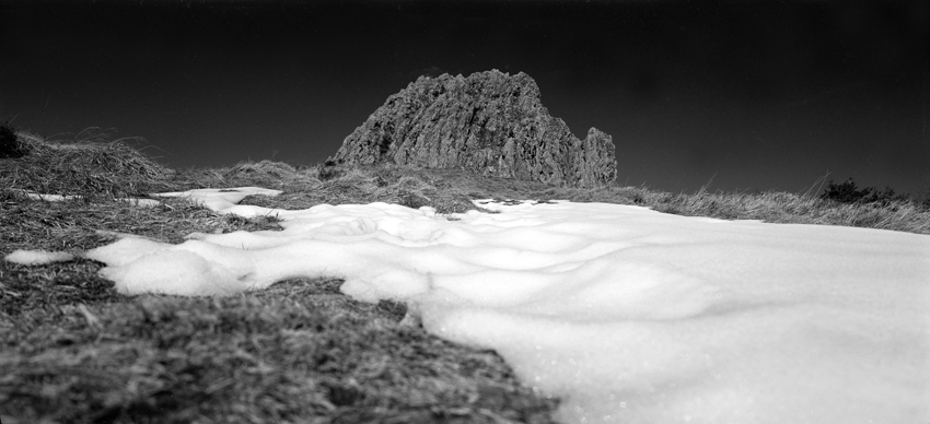 La grande pierre bazanne avec si peu de neige en février.